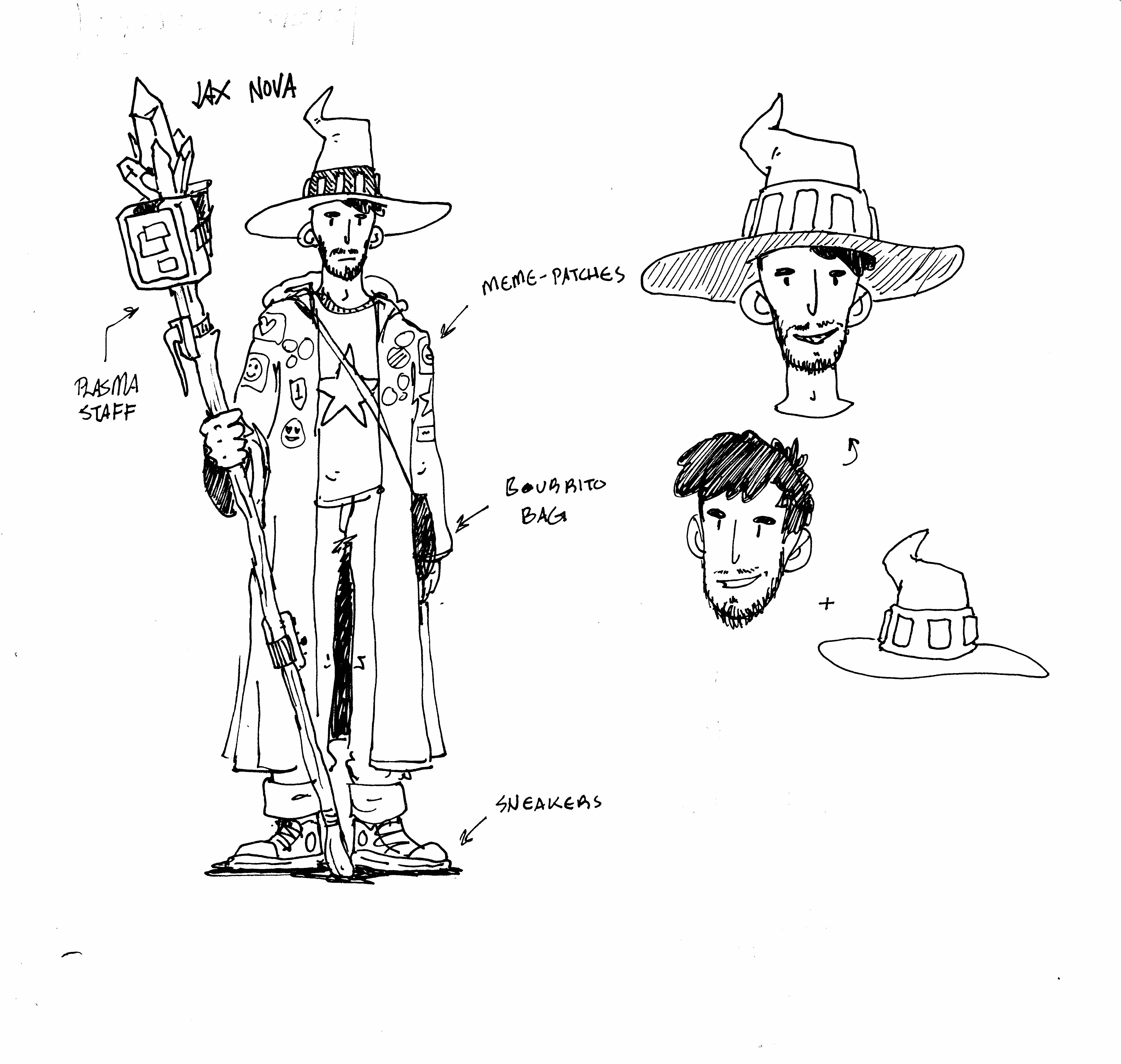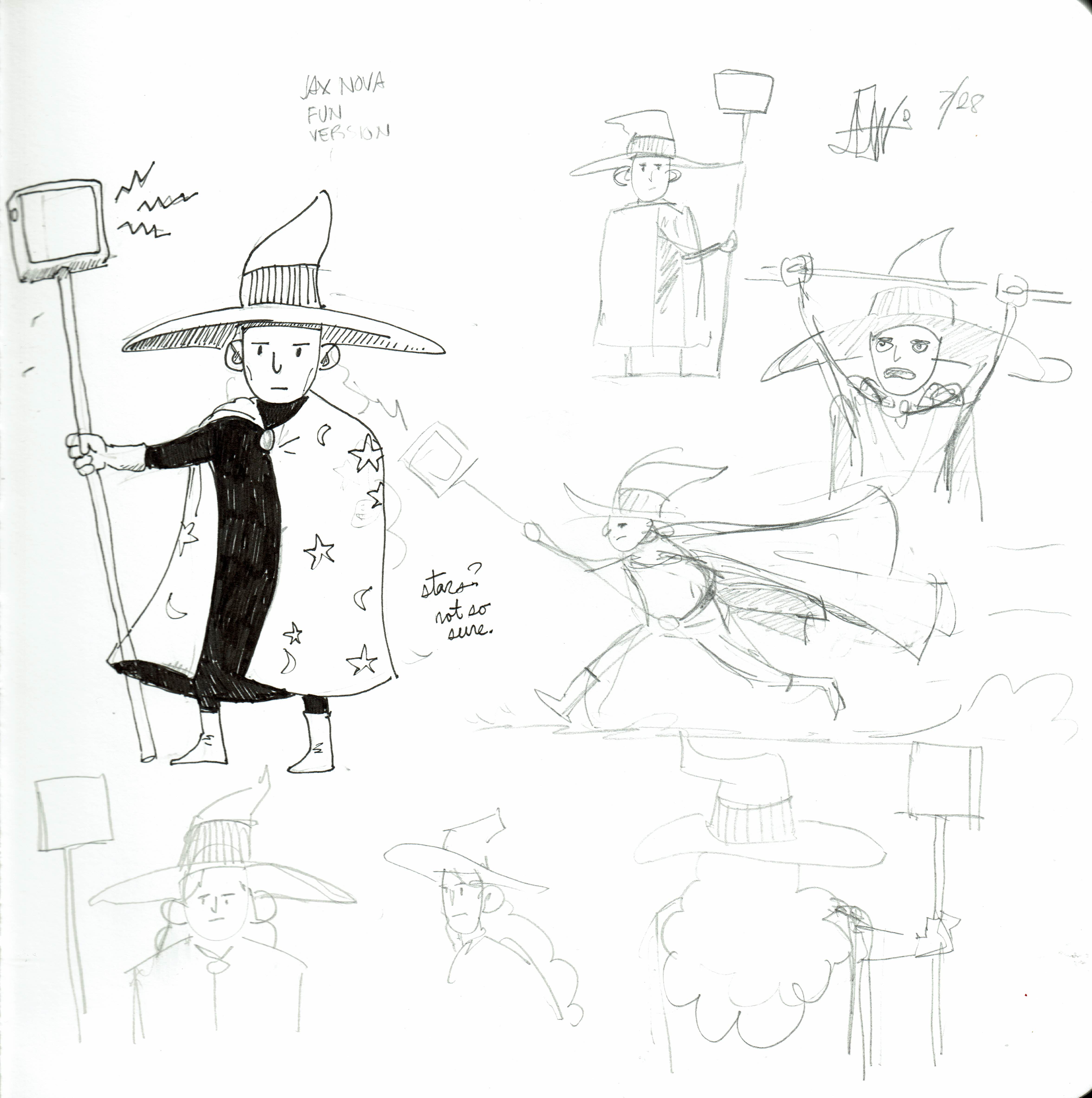 The evolution of Jax has undergone some changes, not only in appearance, but also in the style in which he is drawn. At first he was a shabby, basement-dwelling nerd who figured out how to make his own magic staff. I especially enjoyed designing his staff, crystals and all. But I decided he was too busy (especially the staff), and that if I was to draw a whole comic starring this figure, I wanted to simplify him a bit.