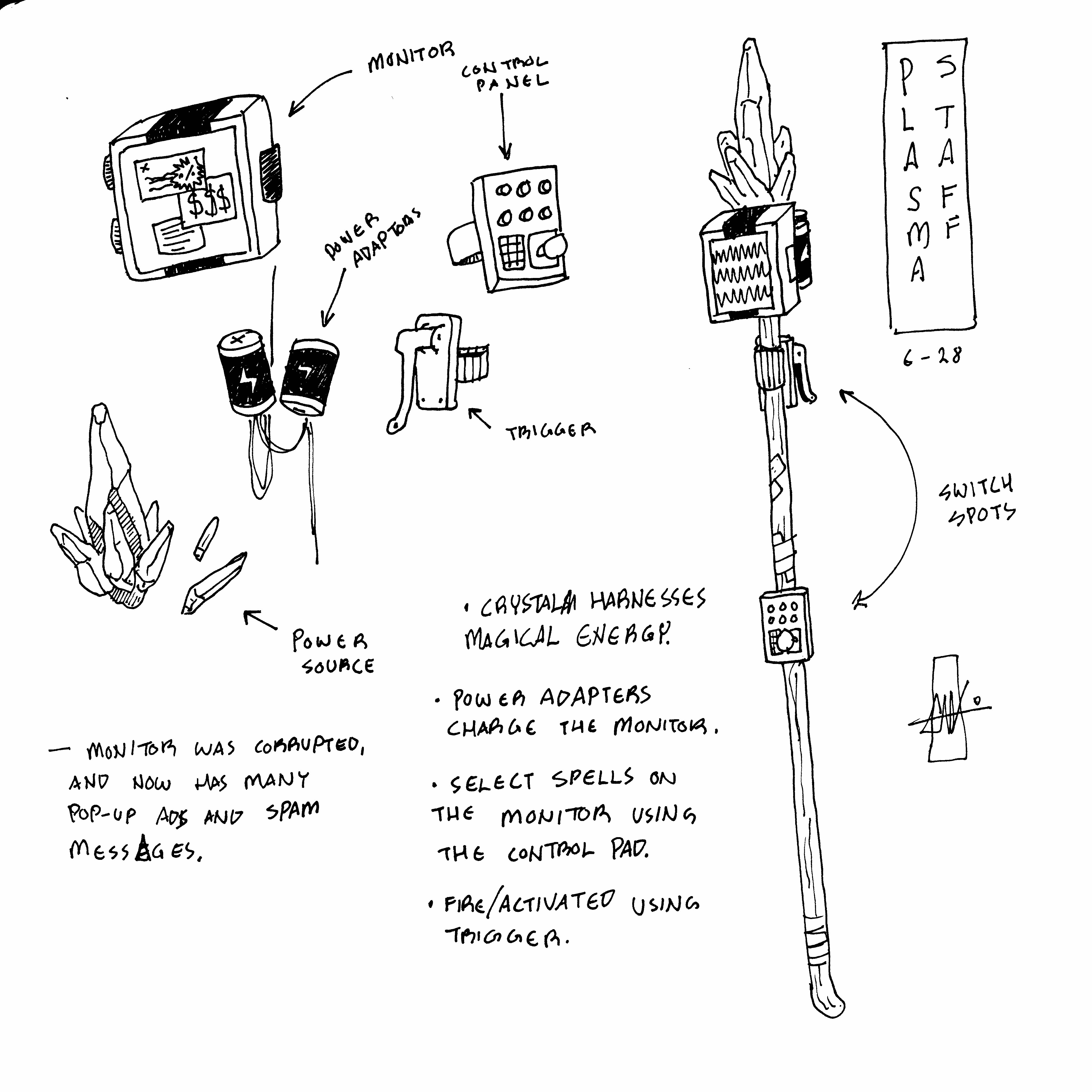 “A sarcastic space-wizard with a plasma staff and a love of microwave burritos. Think Gandalf meets a Twitch streamer. Robe covered in meme patches, plasma staff with a screen on top that glitches. LED-rune tattoos.”
